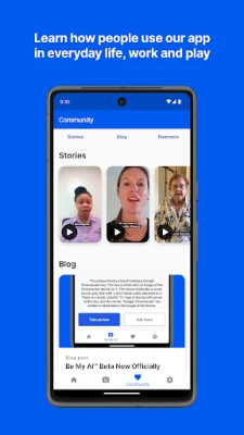 Srce aplikacije Be My Eyes čini globalna mreža predanih volontera, dostupnih besplatno, 24 sata dnevno, 7 dana u tjednu, i to na čak 185 jezika. Bilo da trebate pomoć s čitanjem etiketa, provjerom roka trajanja, ili navigacijom kroz kućanske uređaje, ljudska povezanost nikada nije bila bliža. Predstavljamo i 'Be My AI', pionirskog AI asistenta integriranog unutar Be My Eyes aplikacije. Kao korisnik s oštećenjem vida, možete slati slike umjetnoj inteligenciji koja će odgovoriti na vaša pitanja i pružiti konverzacijske vizualne opise za širok spektar zadataka na 36 jezika – od provjere šminke prije izlaska do prevođenja teksta. 'Be My AI' osnažuje vašu svakodnevicu, pružajući vam dosad neviđen pristup vizualnom svijetu.